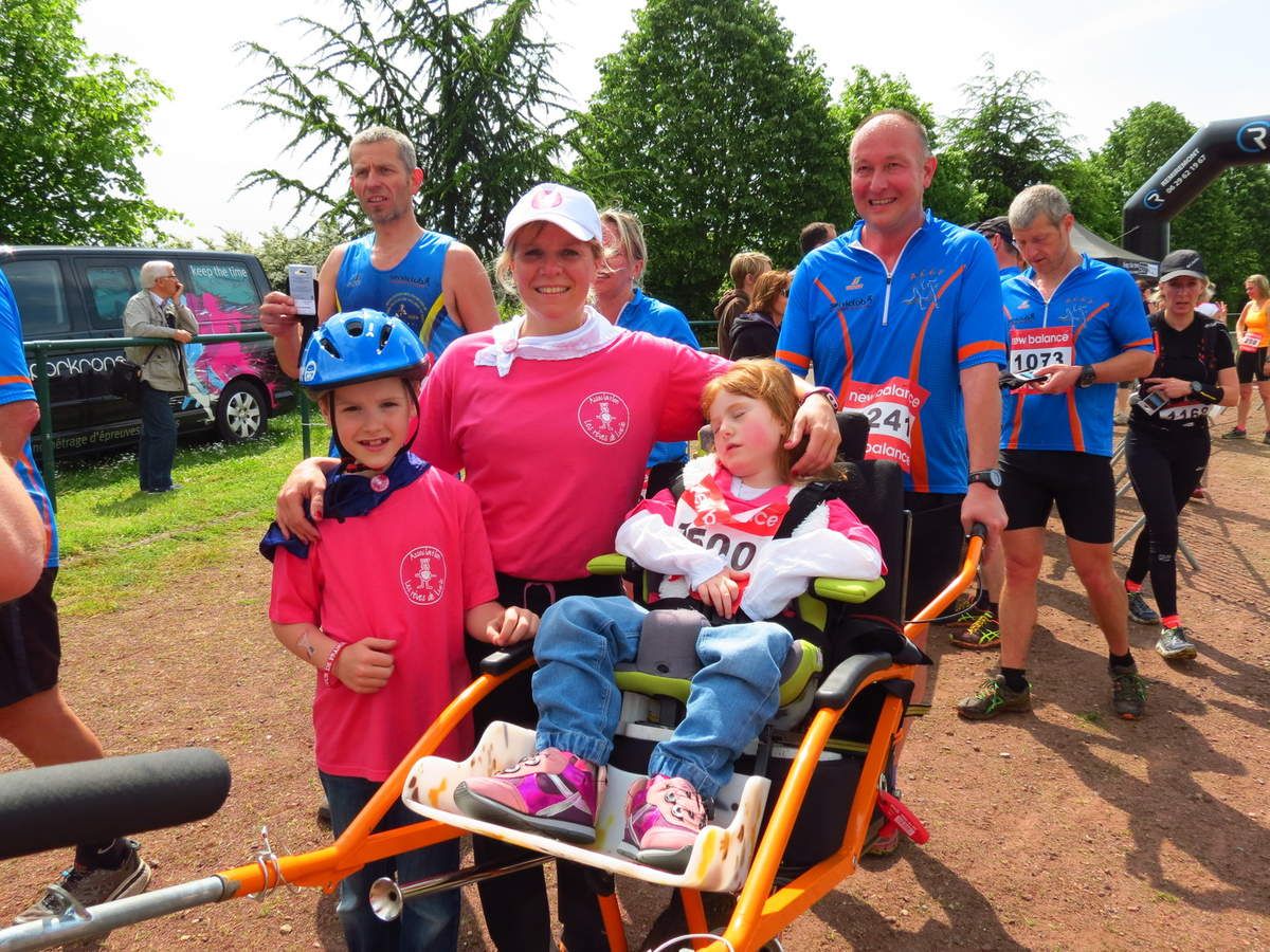 Du rose et du bleu autour de notre Joëlette avec Lucie, Clément son petit frère et Magali la Maman courage. Merci à Roxanne, Sandrine, Izabel, Alain G, Gérald B, Christophe G, Laurent B, Roger M, Alexandre J et Michael M d’avoir accompagné Lucie tout au long de ce parcours. Les sourires à l’arrivée en disent long.